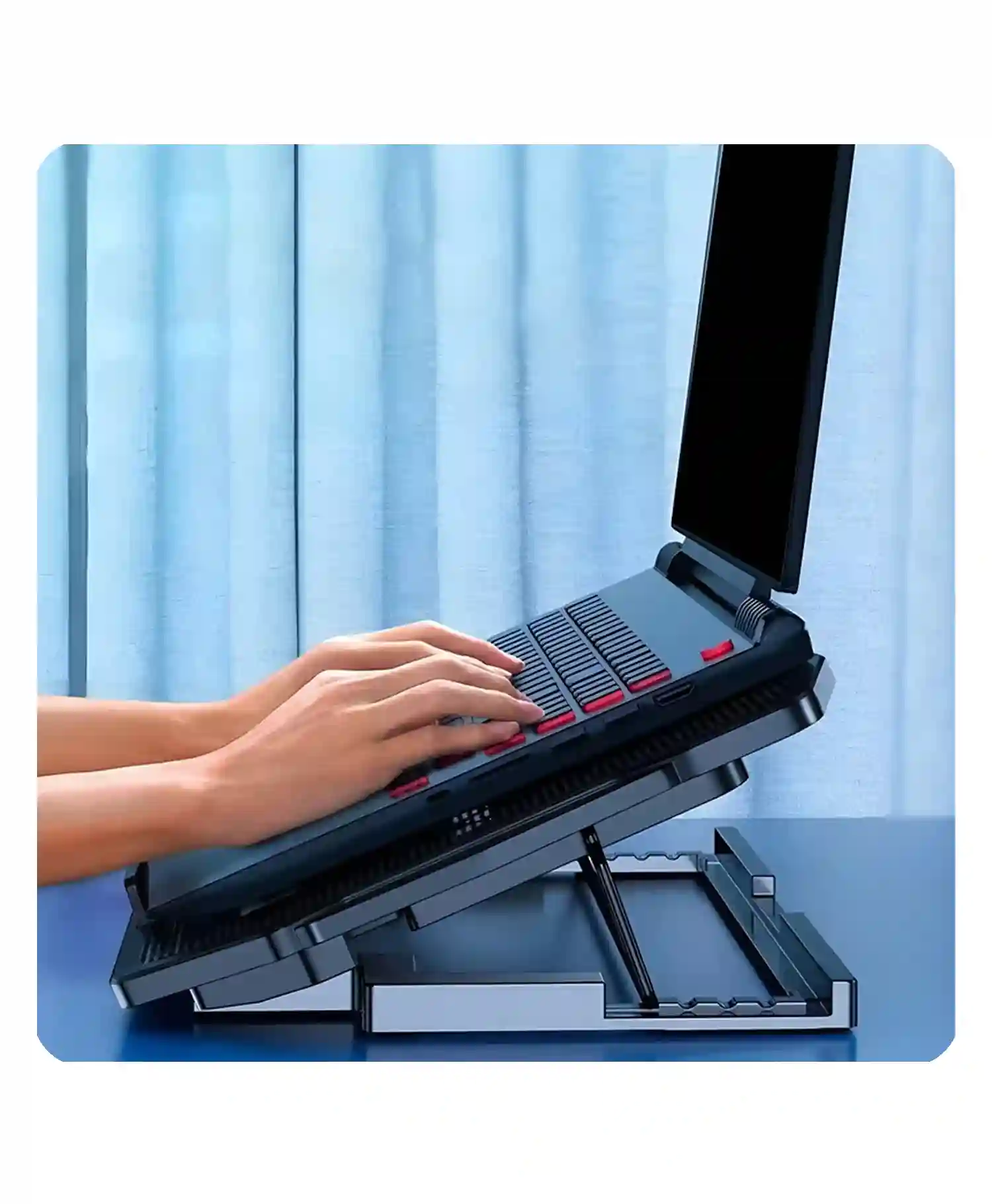 مدل DT-H9 از ترکیب متریال مقاوم و سبک ساخته شده و سطح آن دارای توری فلزی با دوام است که هم ظاهر زیبایی دارد و هم به گردش بهتر هوا کمک میکند. طراحی زاویهدار و ارگونومیک پایه، موجب میشود لپتاپ در موقعیتی قرار گیرد که کار با صفحهکلید و مشاهدهی نمایشگر بسیار راحتتر باشد. در بخش پشتی، پایههای قابل تنظیم در چند سطح ارتفاع مختلف تعبیه شده تا هر کاربر بتواند مطابق نیاز خود زاویه مناسبی را انتخاب کند. این ویژگی به کاهش خستگی دست و گردن هنگام کارهای طولانی نیز کمک میکند.