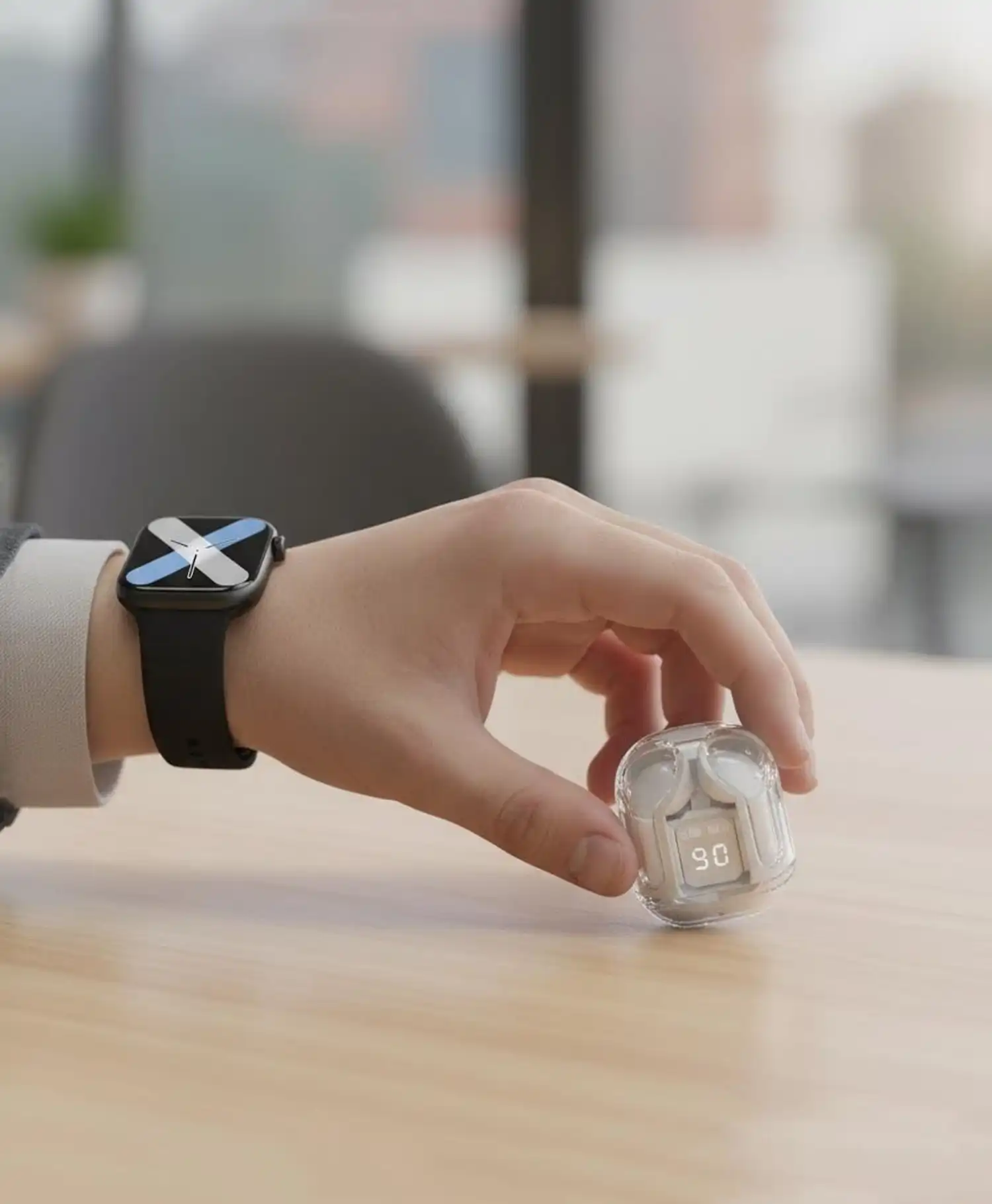 اما سورپرایزهای این جعبه جادویی به همین جا ختم نمی‌شود. در کنار این ساعت همه‌کاره و بندهای متنوع، یک جفت ایرپاد (هندزفری بی‌سیم) بسیار باکیفیت و خوش‌ساخت نیز درون بسته‌بندی قرار دارد. داشتن این ایرپاد به این معناست که شما برای گوش دادن به موسیقی مورد علاقه‌تان در هنگام پیاده‌روی، پادکست‌های آموزشی در مسیر رفتن به محل کار و یا پاسخ دادن به تماس‌های تلفنی، دیگر نیازی به صرف هزینه‌های گزاف برای خرید جداگانه هندزفری بلوتوثی نخواهید داشت. این هماهنگی و ترکیب هوشمندانه در یک پکیج، نیازهای روزمره صوتی و پوشیدنی شما را به صورت یکجا برطرف می‌کند.